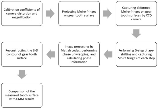 The measurement process of the spur gear tooth surface using the projection moiré method is illustrated in Figure 5. The process is described as follows: