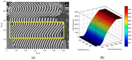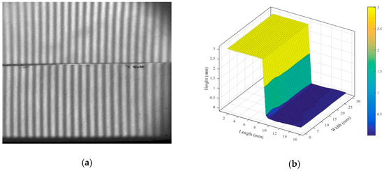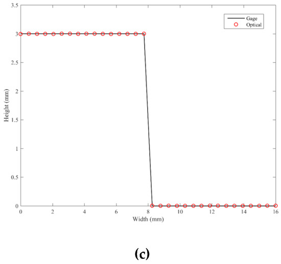 According to the experimental results presented in Table 3, the deviations of the three forms are all smaller than 3 μm, which is the accuracy range of the CMM. To determine the accuracy of our proposed method, a Mitutoyo grade K gauge block of dimension 30(L) × 8(W) × 3(H) mm3 was measured, and the deviation was calculated. Figure 14a,b depicts the moiré fringes on the gage block and the reconstructed 3-D profile by our optical method, respectively. In addition, Figure 14c illustrates the height reconstructed by our method and the nominal height of the gage block. The average value of the height deviation is 2.76 μm.