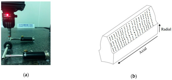 To compare and verify the measured results from the optical method, the gear tooth surface measured by a commercial CMM is used as a reference surface. A photo of the CMM measurement is presented in Figure 9a. The CMM is a Brown & Sharpe XCEL 7.6.5, and the accuracy of the CMM is 3.0 + 4 L/1000 μm, where L denotes the length of the measured feature. In addition, Figure 9b illustrates the radial and axial distribution of the measurement points on the gear tooth surface. The total measurement point number on one gear tooth surface is 2460 points. Curve fitting was applied to build the reference surface using the CMM for further calculation of the deviations from the optically measured surface based on the reference CMM-measured surface.