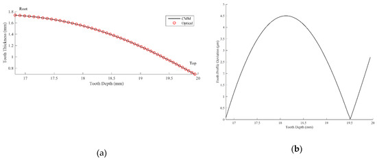 (a) Radial (involute) profiles measured by the CMM and optical system; (b) deviation of the involute profile of the projection moiré system from the CMM method.