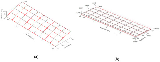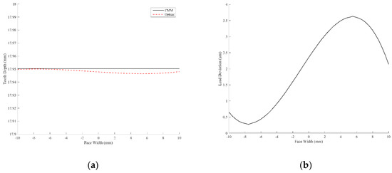 Generally, the data sheet of a gear inspection represents the quality of the gear tooth surface in three parts: (1) Involute profile deviation; (2) lead (axial-direction) deviation; and (3) topology deviation. The ideal profile of the cross-section of a gear tooth along the radial direction is an involute curve. Typically, the profile of the central cross-section of the gear blank is measured when the involute profile deviation is represented, as illustrated in Figure 10a. In addition, the profile along the lead direction is typically measured along the axial direction of the tooth surface on the pitch circle, as depicted in Figure 10b. Furthermore, a topology error represents a 3-D topology deviation of the measured real tooth surface from a reference tooth surface in a set of grid points. In this study, the determination of the three types of deviations was also developed using Matlab codes.