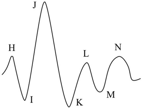 One of the most promising unobtrusive techniques, which has recently regained considerable attraction among researchers, is ballistocardiography, which is the measurement of the body recoil forces resulting from the ejection of blood in the vasculature at each cardiac cycle. BCG was first observed by Gordon in 1877, when he noticed the index of a weighing scale having rhythmic movement synchronously with the pulse of a subject standing vertically on it, he then reproduced a similar motion in a horizontal hammock-wise suspension of the subject []. The scientific research into BCG surged later in the mid-1900s, an era known as the golden age of BCG [,]. The most prominent pioneer in this regard was Isaac Starr, who published what is considered the first scientific works in this field [] and later headed the Committee on Ballistocardiographic Terminology []; since his first publication, he continued to investigate BCG for decades []. Starr was the first to present a model of the signal’s commonest morphology with a proposed terminology [], which was later adopted and promoted by the aforementioned committee [], Figure 1 depicts the signal with the terminology proposed by Starr at that time, which was later elaborated on by other researchers, notably by reporting preceding F and G waves [,]. However, the most prominent segments of the signal are H–L, which represent the systole phase of the cardiac cycle and should be distinguishable in a healthy subject under normal circumstances, since the non-systolic components are less perceptible, especially with a fast heart rate, when superimposition of waves is evident [].