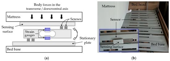 The Load cell setup to measure the body forces in the transverse/dorsoventral axis for comparison with the signal in the longitudinal axis: (a) The load cell structure diagram; (b) the actual sensor placement relative to the bed; the mattress is lifted temporarily for the sake of the picture.