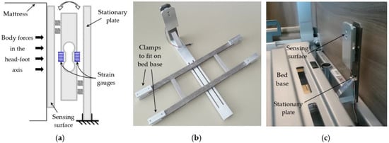 The influence of the force sensor placement on the resulting signals was initially investigated. For this reason, a mechanical structure was designed, which sandwiches the load cell between two parallel plates, with the load cell beam being fixed to each plate at its opposing sides. Firstly, in order to obtain the transverse/dorsoventral signal the sensor was placed horizontally between the mattress and the bed base, below the upper part of a volunteer’s body, similar to the placement of most modern bed-embedded BCG sensors. The upper plate, facing the mattress, is designated as the sensing surface, while the lower one, resting on the bed base, as the stationary plate. Figure 2 (a) depicts the sensor’s structure diagram in this configuration, while (b) shows the actual placement of the sensor in relation to the bed. Secondly, in order to measure the BCG signal in the longitudinal direction, the sensor was set up vertically to sense the body motions transmitted through the mattress at its top side. In this configuration, which is the one adopted for this monitoring system, the stationary plate is made as such by a structure that is attached firmly to the slotted bed base, while the sensing surface faces the top side of the mattress. Figure 3 (a) displays the structure diagram of this configuration, (b) the complete mechanical structure for the longitudinal measurement, and (c) shows the structure fitted on the bed.