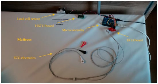 The two sensors are interfaced through an Arduino Uno microcontroller (Arduino AG, Somerville, MA, USA); Figure 4 shows the complete measurement system. The microcontroller reads the force sensor by communicating with the HX711 chip through the Serial Peripheral Interface (SPI) at the maximum available sampling frequency, dictated, as mentioned, by the HX711 chip. The sampling frequency in the case of the board at hand is around 84.8 Hz. On the other hand, the analog ECG signal is sampled at three times that rate, i.e., 254.4 Hz. The microcontroller carries out the sampling at fixed time intervals with proper independent timestamping of both signals. Additionally, the force sensor is scaled to a force unit of millinewton (mN), as per previously established calibration parameters, before forwarding both measurands serially to the PC along with their timestamps. On the PC side, a desktop application organizes and saves the transmitted data, namely, the Processing Integrated Development Environment (IDE) (Processing Foundation, processingfoundation.org).