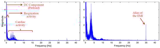 The force sensor in its basic setup delivers a signal containing various components. Naturally, it senses all motions induced by the body, whether caused by cardiac or respiratory activities, or any voluntary muscle movements. Additionally, depending on the surroundings, vibrations through the floor might be picked up in the signal, not to mention the electromagnetic interference (EMI), and the DC component present due to the necessary preloading by initial contact with the mattress. Figure 5 displays two frequency spectrum diagrams of the sensor’s raw signal that are truncated for the convenience of display. These two sample signals were taken from two volunteers lying in the supine position; both are depicted to showcase the variability of the BCG waveform even in the frequency domain. In order to separate the sought-after components from the aforementioned artifacts as well as from one another, signal filtration is implemented digitally by means of Matlab (The MathWorks, Inc., Natick, MA, USA).