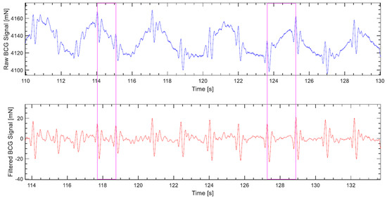 The reported frequency bandwidth of interest for the cardiac component varies among publications, where the cutoff frequencies range between 0.1–1 Hz for high-pass filters, and 10–25 Hz for low-pass filters []. Previously, namely in Reference [], we assumed the bandwidth of 0.5–20 Hz and carried out the filtration accordingly; however, since then, with further experimentation and new measurements taking place, the bandwidth 0.5–15 Hz, was found empirically to yield overall more fruitful results as far as heart rate monitoring is concerned. Moreover, the BCG signal is obtained by implementing finite impulse response filters (FIR), which are advantageous in the sense that they do not induce any phase distortion in the filtered signal because they maintain a perfectly linear phase response. Specifically, the fircls1 filter function is used, which is an inbuilt function in Matlab that facilitates additionally the fine-tuning of the levels of ripple and attenuation in the passband and stopband, respectively. The lengths of the low- and high-pass filters were 80 and 540, respectively; whereas the levels of ripple and attenuation in both filters were set to 0.005% and 0.01%, respectively. In the upper plot of Figure 6 a sample raw load cell signal is plotted, while its realigned filtered counterpart is shown in the bottom plot.