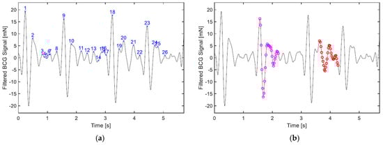 The BCG signal is run through the algorithm in segments, each with a length of 10.66 s; effectively it is 10 s since there is 0.66 s of overlap between successive operations. Firstly, the derivative of the signal is calculated, through which the local maxima that presumably represent the upward waves in the signal (H, J, L, etc., see Figure 1) are identified, this step is depicted in Figure 7a. Afterwards, feature vectors are formulated. The feature selection here is straightforward; each feature vector begins with a local maximum point and contains the segment of the signal that follows.