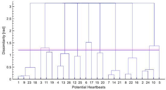 To conclude the hierarchical clustering meaningfully a threshold for the angular dissimilarity, θ, is employed. The clustering that occurs up to this level of dissimilarity determines the final clusters, and beyond which any clustering is discarded. This threshold was empirically tuned to a value of 1.2 (rad); the magenta line in Figure 8 depicts this parameter. The final step of the algorithm is choosing a cluster that reflects the cardiac cycles best. Two criteria are utilized for this purpose, the second of which comes into effect, only if the first was indecisive: