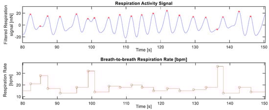 Sample of the workings of the respiration rate calculation method. The upper plot depicts a respiration signal with red asterisks marking the detected local maxima, i.e., the inhalation peaks, while the corresponding calculated breath-to-breath respiration rate is shown in the lower plot.