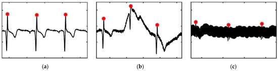 ECG signal samples with QRS complexes marked with red asterisks: (a) the common form; (b) baseline fluctuation; (c) large EMI.