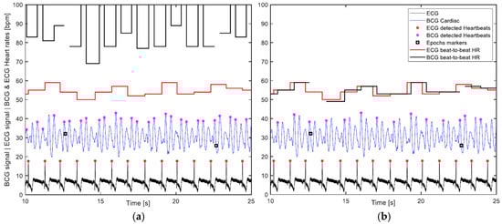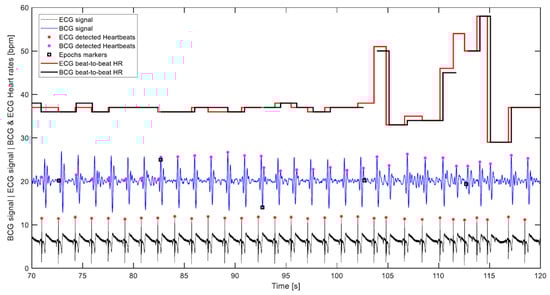 - The correct detection was evaluated visually, which was carried out by plotting the BCG and ECG signals with their respective heart cycles’ detection markings and corresponding calculated heart rates. Figure 11 displays part of a signal undergoing visual assessment.