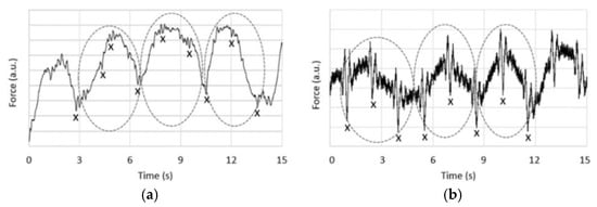 The preliminary measurements that were carried out to assess the influence of the force sensor placement on the signals revealed that the respiration component generally dominates the transverse/dorsoventral signal, i.e., when the sensor is placed under the mattress (see Figure 2). This can be seen in Figure 12a by the magnitudes of the respiration waves marked with circles when compared to the much smaller BCG waves marked with “x”. Whereas in Figure 12b, which corresponds to the longitudinal BCG setup (see Figure 3), the magnitudes of the respiration and BCG components are much more comparable. This improves the quality of the BCG signal by facilitating a more optimized signal amplification and more effective filtration of the respiration component.