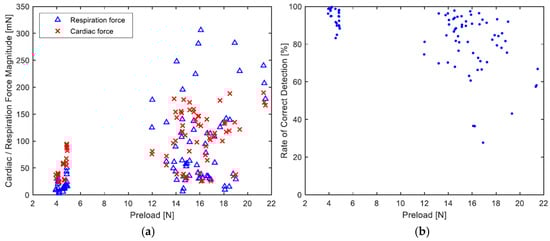(a) The relation between the sensor preload and the magnitude of the corresponding cardiac and respiration forces. The respiration force magnitude is evaluated by its average peak-to-peak amplitude, whereas the cardiac force is assessed based on the standard deviation of the signal sample points since the signal generally assumes a Gaussian distribution; its magnitude is determined as 6 σ. (b) The relation between the preload and the resulting rate of correct detection.