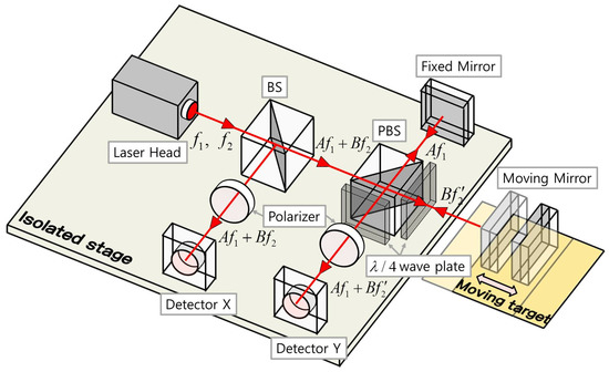 The heterodyne laser interferometer is a device that measures the displacement using the optical Doppler effect. The heterodyne laser interferometer used for precision length measurement is applied in the fields of vibration control and semiconductor manufacture, and measures a wide displacement range from sub-nanometer up to several meters. The heterodyne laser interferometer uses two light beams with different frequencies, which are polarized and orthogonal to each other [16,17,18,19,20,21,22]. Two light beams passing through a beam splitter (BS) are emitted from the laser head.