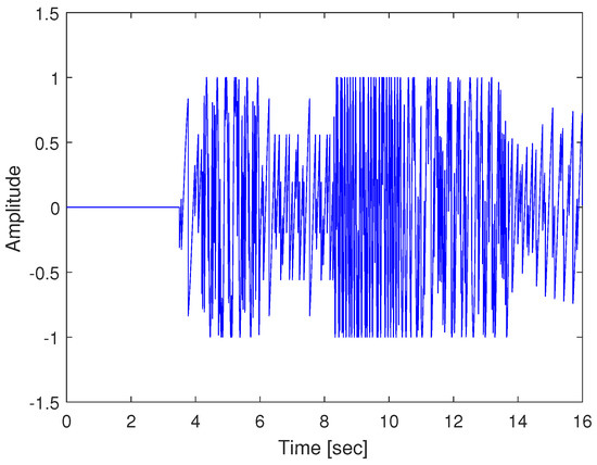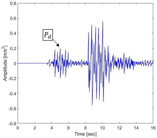 Figure 3 shows the laser interferometric intensity signal () for spectrum analysis with = 2 in Equation (6). The arrival time of the P- and S-waves can be determined by the extremely densified intensities of , since the density of is proportional to the acceleration amplitude of the seismic wave measurements. The extremely densified points of in Figure 3 can be interpreted as the arrival time of the P- and S-waves at 3.5 and 8.2 s, respectively. Thus, the epicentral distance is computed with the P-S time of 4.7 s. Figure 4 shows the acceleration of the seismic wave movement measured by a laser interferometer. The value is the maximum acceleration value from 3.5 to 6.5 s since we confirmed that the arrival time of the P-wave is 3.5 s. In Figure 4, the value is 0.199 m/s at 4.824 s. The magnitude of the earthquake can be calculated using the obtained epicentral distance and the value through the TNEO based regression model denoted by Equation (18).