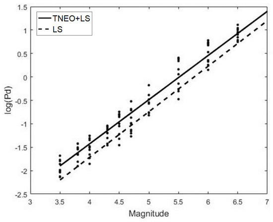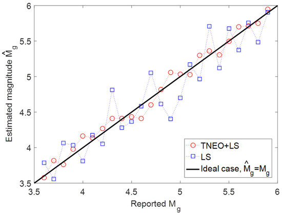 In Figure 7, magnitudes of 200 separate events have been estimated using an LS solution based on the TNEO model (Equation (14)) and the LS solution based on the general model (Equation (10)), respectively. As a solution for both models, the least squares algorithm is applied with the same conditions. To compare the estimation performance, each data group under the same magnitude is used for a separate estimation process. In Figure 7, the circle marker and the rectangular marker denote the average of the estimated magnitude per each data group using TNEO model and LS model, respectively. For an ideal case, should be equal to . As shown in Figure 7, the result of TNEO model estimation is relatively close to the ideal case compared with the general LS estimation.
