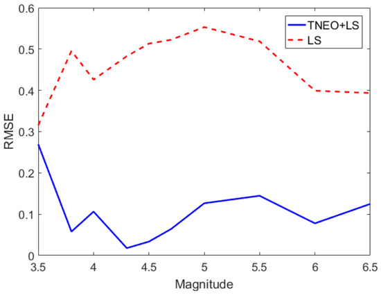 Figure 5 shows the results of the relation derivation with the standard least squares (LS) algorithm and TNEO regression model based on the data. In Figure 5, the dots refer to the seismic records that are used as reference data from USGS. The solid line and the dashed line denote the estimated relationship between and the magnitude using TNEO and the LS algorithm, respectively. The average error value of for each magnitude using the LS method and the TNEO model are 0.5945 and 0.2659, respectively. The magnitude prediction algorithm based on the TNEO model becomes more effective than the standard LS algorithm. Figure 6 shows the root mean square error (RMSE) of the magnitude estimation using the TNEO model and LS method. The dashed line represents the RMSE of the estimation using the LS method and the solid line denotes the result of the proposed TNEO model. As shown in Figure 6, the estimation using the LS algorithm shows a higher average RMSE value than that using the TNEO model at each interval.