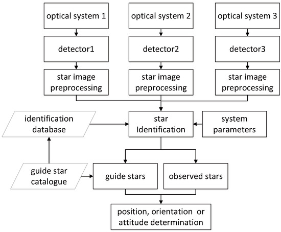 The working principle of the three-FOV star sensor is shown in Figure 1. It consists of three-FOV and each FOV can capture stars on its detector. The centroids of stars in each FOV can be obtained by star image preprocessing and centroid calculation. Then the star identification is conducted with the identification feature database and the centroids. Due to the characteristic of the three-FOV star sensor in combining all the stars in the three FOVs for star identification, the identification database is usually quite large. The identification feature database of the three-FOV star sensor is established based on the guide star catalog, obviously, downscaling the guide star catalog is an efficient way to make the identification feature database smaller and speed up identification. The observed stars in each FOV can be identified and matched with the guide stars in the guide star catalog. The accurate vector information of the observed and guide stars can be used to calculate the position, orientation, or attitude of the star sensor.