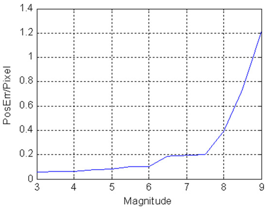 The relationship between the centroid estimation error and the magnitude of stars is shown in Figure 3. It can be seen that the centroid estimation accuracy is inversely proportional to the magnitude of stars. The reason is that the star with higher brightness usually has higher SNR and the smaller centroid estimation error is obtained.