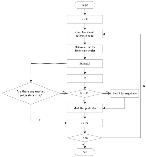 - If there is only one star in , the star is marked as the guide star directly. Otherwise, the stars in should be sorted according to the magnitude, and the brightest star is marked.