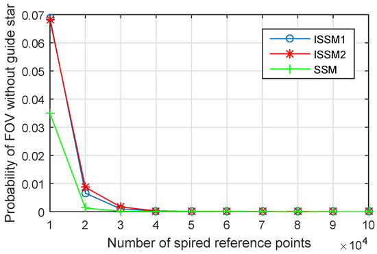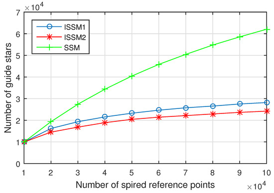 The number of guide stars obtained by different methods and different number of reference points is shown in Figure 6. The number of guide stars with SSM is much more than the two improved methods, and the selected guide stars with ISSM2 is lesser than ISSM1, which is consistent with our expectations. With the increase of reference points, the number of guide stars shows a steady increasing trend and the completeness of the guide star catalog is better. However, the burden of star identification is also increased. So, the way to find an optimal number of the reference points is discussed in Section 3.2.3.