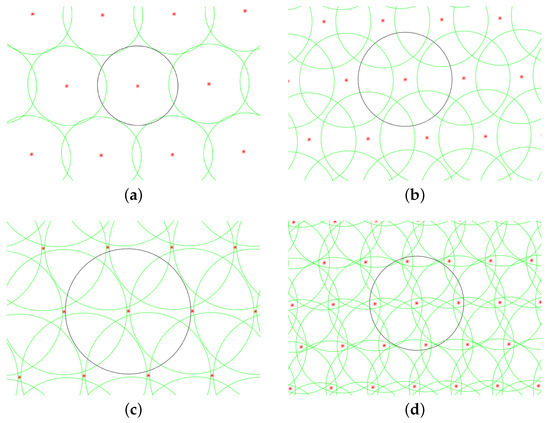 For example, the radius of the FOV is , by Formula (8), 13,132 reference spherical circles can cover the whole sphere. According to Figure 7, the least number of reference points for satisfying the completeness is 50,000, which is about four times of . Figure 8 shows the coverage of the spherical circles on the sphere when the number of reference points is 1, 2, 3, 4 times of . The black circle is an arbitrary reference spherical circle and the green circles are the adjacent spherical circles. It can be seen that when the number of reference points is 4 times of , the black circle is overlapped by the adjacent reference spherical circles. The completeness of the guide star catalog is consistent with the coverage area of reference spherical circles and it is appropriate to select 4 times of as the number of reference points.