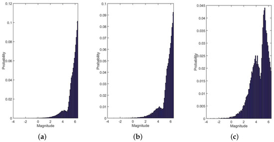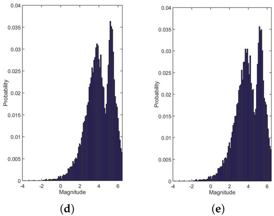 The magnitude characteristics of the guide star catalogs are shown in Figure 10. The magnitude distribution of guide star catalog generated by SSM (Figure 10b) is basically consistent with the one generated by using MFM method directly (Figure 10a), so SSM is not in accordance with Selection Constraint , this result is the same with the analysis in Section 3.2.1. The magnitude characteristic of 1st-SOPM method (Figure 10c) is better than SSM, but the magnitudes of the guide stars are still concentrated in the range of 4–6 magnitude. The magnitude characteristics of ISSM1 (Figure 10d) and ISSM2 (Figure 10e) are inclined to the low-magnitude region compared with the 1st-SOPM method, so, ISSM1 and ISSM2 are more in line with Selection Constraint . The magnitude distribution of the guide star catalog generated by ISSM2 is not as good as ISSM1, which is because not all the brightest candidate stars in reference spherical circle are chosen as guide stars in ISSM2.