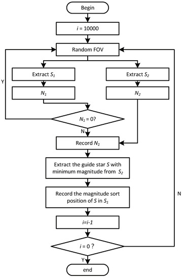 A test platform based on the Monte Carlo method is established for analyzing the performance of the guide star catalogs generated by different methods. The flow chart is shown in Figure 11. For each simulation, a random boresight direction of FOV is selected. Then the star set of the FOV is extracted from the basic star catalog which is generated by MFM 6.5 method. Meanwhile, the guide star set is extracted from the guide star catalog. and are the numbers of the stars in and respectively. If is equal to 0, which means that in this case, there is no observed star in the FOV, so we treat this case as invalid case. Otherwise, the number of guide stars is recorded for the following analysis. Besides, the brightest guide star S is extracted from the star set and the rank of brightness of S in the star set is recorded. By this index, whether the guide star catalog is in line with Selection Constraint can be analyzed. The number of Monte Carlo simulations is 10,000. As shown by the analysis performed in Section 4.1, SSM does not follow Selection Constraint , so SSM is discarded in the following analysis.