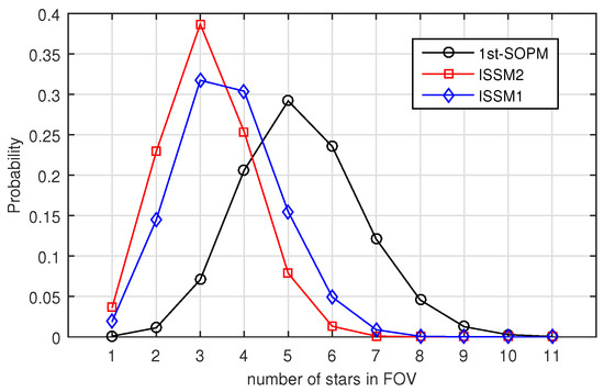 With the simulation result , the performance related to the Selection Constraint I is analyzed. For each guide star selection method, the probability of the guide star number in FOV can be calculated with , and the probabilities of ISSM1, ISSM2 and 1st-SOPM are shown in Figure 12. All the three methods can meet the requirements of Selection Constraint I. There are guide stars in every FOV. Among them, the mean value of guide stars in the FOV of ISSM1 is 3.618573, and the standard deviation is 1.172465. For ISSM2, the mean value is 3.151795 and the standard deviation is 1.029260. For 1st-SOPM, the mean value is 5.297090 and the standard deviation is 1.393487. It can be seen that the number of guide stars in the FOV of ISSM2 is the least and the local uniformity is the best. Therefore, with regard to Selection Constraint I, the performance of ISSM2 is the best among the methods, and ISSM1 is better than 1st-SOPM.