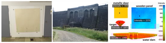 Two examples from practice [3]. Left: Wooden Panel; Middle: water dam; Right: Point clouds with intensity values.