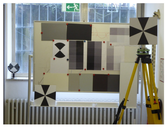 Figure 3 presents the setup which was made of black and white targets, cardboards with different shades of gray and different gray scales printed on a sheet of paper. All these targets are fixed to a magnetic wall. In an earlier setup, different colors were used as targets, but the result of the examination was that colors do not have the same influence on the reflectivity as targets with different gray scales. Thus, there was not enough variety in the intensity values. Consequently, a new setup was built with gray scales. The targets were scanned several times with incidence angles of , , and and distances of 8 m and 22 m. This time, the data collection was carried out again with a Leica HDS6100 TLS, but not with the same instrument as before and with a Leica ScanStation P20.