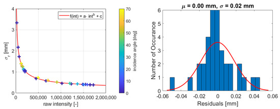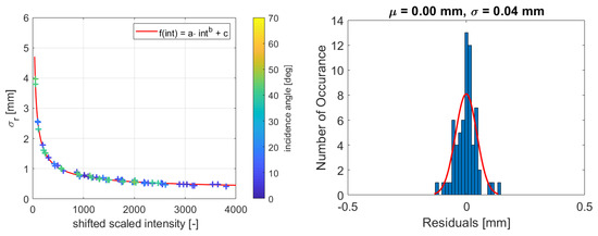 This section investigates the samples of the Spectralon targets (Section 4.1). The range precision is calculated for each sample and Figure 5 shows the estimated function from Equation (5) on the left with the corresponding histogram of the residuals on the right. It is visible that all samples fit the function very well, which is confirmed by the coefficient of determination of B = 0.99 (Equation (6)). The residuals are distributed around zero with a maximum deviation of 0.02 mm. Due to the limited number of 34 observations, the histogram does not strictly follow a Gaussian distribution, but no significant systematic deviations are visible.