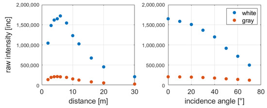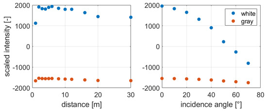 As seen in Equation (1), the strength of the reflected signal strongly depends on the range and on the incidence angle. These two parameters are chosen for investigation because the others almost remain constant while measuring with the same target and instrument. Figure 7 shows the relation between distance and raw intensity on the left as well as incidence angle at a distance of 6 m and raw intensity on the right. These results are obtained from the measurements of Section 4.1.