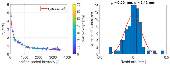 In Figure 5 (left), the different colors indicate the different incidence angles. It is obvious that samples with high incidence angles also fit the function as they are not deviating more than the samples that are taken with zero-degree incidence angle. In [11], it is demonstrated that this method works with samples that are aligned perpendicular to the scanner. This study shows that samples with higher incidence angles do not deviate from the other samples as the magnitude of the residuals is not higher than the magnitude of the residuals with zero-degree incidence angle. Both types of residuals are distributed around zero with the same order of magnitude. Hence, it is concluded that the incidence angle does not have a substantial influence on the function. This implies that the method presented in this paper is capable of dealing with high incidence angles if the measurement components are not weighted equally in the plane adjustment as explained in Section 3.1. Consequently, the model is capable of modeling both the influence of the range and the influence of the incidence angle.