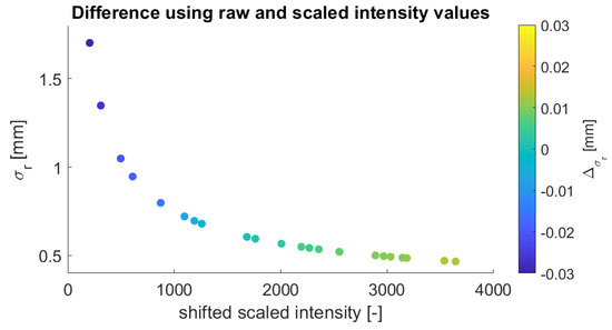 The estimated precision from the function for the corresponding intensity value of the largest absolute deviation in Figure 11 is 1.78 mm. Consequently, the maximum difference between raw and scaled intensity means 1.7% of the estimated precision from the function. As this value is very small, it is assumed that this difference does not have a significant influence on the function. Following, it indicates that the functional relation can also be modeled with the scaled intensity values for this data set.