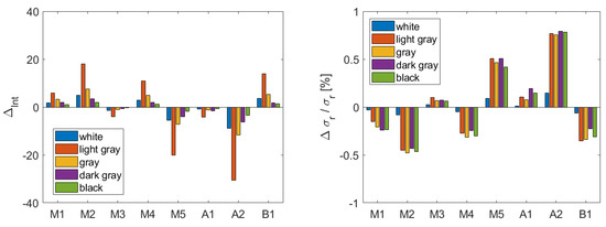 The biggest difference is visible for the second brightest panel (light gray). The smallest difference is obtained for the panel with low reflectivity (black). The function, which models the relation between range precision and intensity, has the largest variations for low intensities. However, the resulting differences of the range precision are less than 1% of the actual values in the function for the inherent intensity, which is very small and hence, negligible.