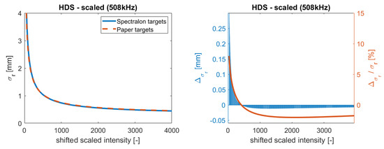 In Figure 6, the resulting function is compared to the function that was estimated in Section 5.1. The left plot shows the functions and the right plot the corresponding difference between them including its percentage share. Comparing the two functions, they look almost similar. A slight deviation in the curviest part of the function is visible. However, considering the differences on the right in Figure 6, it is visible that the functions vary and that the deviation is systematic. Especially, for small intensities, the values increase up to 0.15 mm. This results from the empirical data set with different scanners and the uncertainties that are yielded from computing the mean intensity values for one sample. Hence, the functions have uncertainties, which cause deviations in the function. Nevertheless, the largest deviation is smaller than 10% of the range precision. This implies that, with a tolerance of 10%, the function can also be estimated from a setup, which is not associated with high costs and which is easy to install. Furthermore, the function is reproducible for this scanner type and for these different setups.