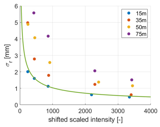 Hence, it is clear that scaled intensities cannot follow the function established by [9] as already pointed out in [9,11]. Since the intensities are amplified with the distance, the intensity does not cover the influences of incidence angle and distance on the range precision. Nevertheless, the next sections investigate whether there is any possibility to estimate the range precision with scaled intensities at least for limited ranges.
