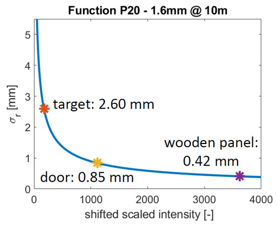 The objects were scanned with a resolution of 1.6 mm @ 10 m. Hence, the precision of the scan points is estimated with the parameters of this resolution. They are taken from Table 1. The intensity needs to be shifted by 2050 as explained in Section 6.2. Since the variation of the intensities within a point cloud is low, one point is randomly chosen in each point cloud. Figure 15 shows the range precision of these points. The range precision notably varies a lot. The most precise range measurements are obtained for the wooden panel, the least precise for the black target. This is not surprising considering their intensity values.