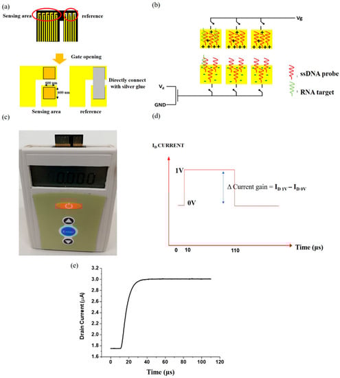 In this study, the signal transduction was carried out using n-channel depletion mode MOSFET (#LND150; Supertex Inc., Sunnyvale, CA, USA)The gate voltage was applied in the form of a short duration (100 µs) pulsed bias with an amplitude of 1 V, and the drain voltage was a constant bias of 2 V. The difference of the absolute drain current before and after applying the gate voltage was used as the sensor signal and was denoted as gain.