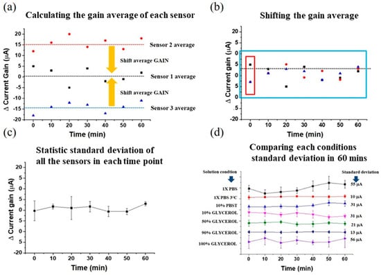 To account for variations arising from MOSFET drain current drift due to thermal or external noise, we subtracted the gain of MOSFET from the absolute gain obtained as output from our sensor. This difference, denoted as ΔGAIN, was therefore used to analyze all the experimental results in this work. We defined fluctuation of the electrical signal as sensor stability, and used the standard deviation formula to calculate the electrical signal fluctuation. However, one sensor’s ΔGAIN may be different from that of another, due to sensor-to-sensor variations. In order to statistically analyze all the sensors’ standard deviations, we calculated the average of ΔGAIN for each sensor, as shown in Figure 2a, and shifted the average of ΔGAIN to the same baseline value, as shown in Figure 2b. Finally, the baseline adjusted sensor responses were plotted with respect of time, as shown in Figure 2c. We then can compare sensors in different solutions through time, as shown in Figure 2d.