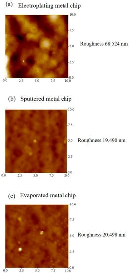 Surface roughness measurement by atomic force microscope (AFM) for (a) electroplated metal chip, (b) sputtered metal chip, and (c) evaporated metal chip.