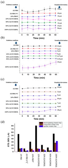 (a) Electroplated gold electrode chip stability in different conditions (1× PBS in RT, 1× PBS in 3 °C, 10% PBST, 10/50/90/100% glycerol in 1× PBS). (b) Sputtered gold electrode chip stability in different conditions (1× PBS in RT, 1× PBS in 3 °C, 10% PBST, 10/50/90/100% glycerol in 1× PBS). (c) Evaporated gold electrode chip stability in different conditions (1× PBS in RT, 1× PBS in 3 °C, 10% PBST, 10/50/90/100% glycerol in 1× PBS). (d) Standard deviation versus test environment.