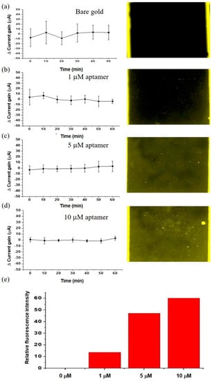 The signal transduction of FET biosensor relies on the surface bound receptor and ligand interactions. The change in surface potential and the charge density due to the electrostatic binding of receptor and target biomolecule lead to modulation of the FET drain current. Therefore, surface functionalization is an important aspect of surface affinity sensors such as FET biosensors. To investigate the effect of sensor stability and surface functionalization, we characterized different sensor chips fabricated with evaporated gold electrodes, with varying levels of functionalization. The gold electrodes were cleaned using UV ozone etching, followed by washing in mild acid and deionized water. The cleaned sensor chips were placed in testing buffer and electrical measurement was carried out for 60 min, at intervals of 10 min. The same electrical measurement process was also repeated after the sensor chips were functionalized with aptamer molecules (single stranded DNA) in final concentrations of 1, 5, and 10 µM. The results are shown in Figure 5. When there were no surface bound aptamer molecules (Figure 5a), the standard deviation was the largest. To verify the immobilization of the aptamer, we utilized fluorophore tagged aptamer molecules to be immobilized on the sensor surface. The fluorescence images depicted alongside the electrical results demonstrate the level of surface functionalization. In the functionalized sensor chips with varying densities of immobilized aptamers, the standard deviation values were proportional to the final concentration of immobilized aptamer: 1 µM > 5 µM > 10 µM. The corresponding fluorescence images are shown alongside Figure 5b–d. It can be seen that when the final concentration of aptamer used for immobilization was 10 µM (the highest), the fluorescence intensity was the highest and the electrical stability was significantly improved. Conversely, when the final aptamer concentration of 1 µM (lowest) was used, the intensity was the lowest and electrical stability was poor, better only than the blank condition. The fluorescence intensity analysis with respect to final concentration of aptamers used for immobilization is depicted in Figure 5e. Table 2 summarizes the standard deviation values obtained under different conditions of surface functionalization. From the results in Figure 5, it can be deduced that the presence of surface bound aptamer molecules improves the electrical stability of the sensor. This can be attributed to the addition of charged or polarizable molecules on to the sensor surface, which re-distribute the electrical double layer in the gold/test liquid interface. The charge density in the interface is influenced and directed by the immobilized aptamers, which counteract the random fluctuations created by Brownian motion of particles. Addition of charged molecules to the gold surface has previously been shown to significantly influence the interfacial potential. In our experiments, we demonstrated that the control of surface topography, solution composition and consistency, ambient conditions, and surface functionalization can regulate the interfacial interactions leading to improvements in the electrical stability of extended gate FET biosensors.
