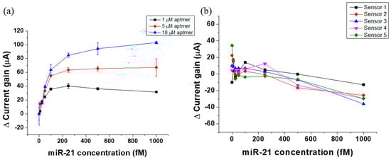 (a) 1/5/10 µM DNA probe immobilized sensor chips calibration curve showing current gain versus miRNA concentration (miRNA concentration 0/10/25/50/100/250/500/1000 fM). (b) Testing miRNA (0/10/25/50/100/250/500/1000 fM) in 1× PBS on bare gold surface of sensor (non-functionalized sensor).