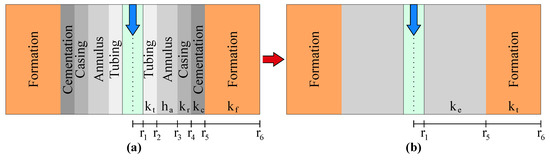 Equivalency between a well commonly used in the oil industry and a simplified structure of a well based on the wall layers conductivity analysis. (a) Profile of a typical structure found in the oil industry composed by: cementation, casing, annulus and tubing. The parameters , , and are the respective heat-transfer mechanism coefficients and , , , and the respective radiuses; (b) Simplified structure where all the coefficients are represented by a equivalent parameter .