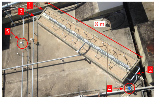 Top view of the prototype well once built. 1—well-head; 2—injection zone 1; 3—injection zone 2; 4—flow sensor; 5—flow sensor.