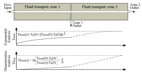 As shown in Figure 1b,c and observed in the oil-fields, in a thermal steady state operation, each flow rate into a transport zone generates a correspondent thermal profile in the fluid, in a one-to-one parity. There is a mathematical relationship between the thermal profile along the well and the flow distribution. Therefore, knowing the thermal profile function, the relationship can be used to derive the correspondent flow distribution [21,25]. From Figure 1, the flow rate generates a thermal profile in the injected fluid closer to the geothermal profile when compared to the flow .