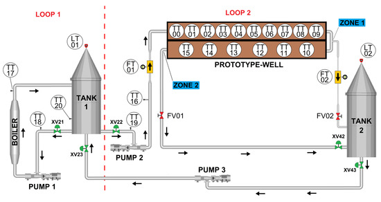 The general operation is divided in two loops: loop 1 heats the water used in the tests; loop 2 transfers the water to the prototype well. The arrows in Figure 5 indicate the direction of the water flow.